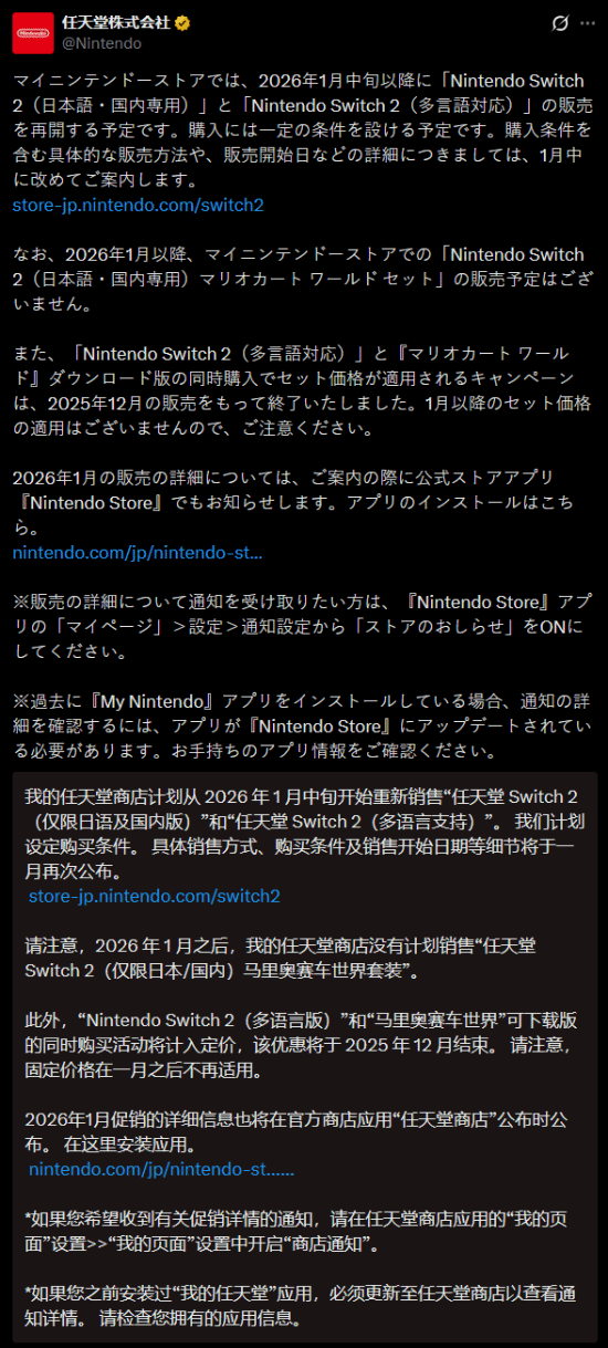不过,任天堂当时还表示,将在2026年1月中旬以后,补货并重新销售日语版以及多语言版Switch 2(即标准版),但在购买时会设下一定的条件,包括购买条件在内的具体销售方式、正式开售日期等详细信息将在1月份之内另行公布。