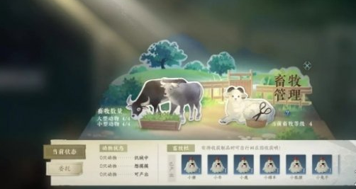 畜牧分为【小型动物】和【大型动物】,动物在管理的时候,会出现以下三种情况【饥饿中】、【想摸摸】、【可产出】,根据这些情况指示来选择操作方法。